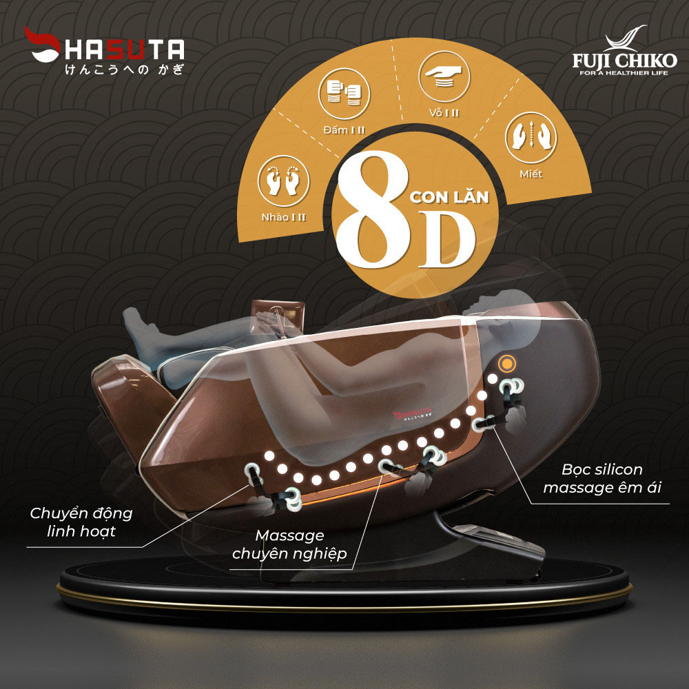 Ghế massage FUJI CHIKO FJC - 935 là dòng ghế cao cấp được nhà Hasuta ưu ái tích hợp công nghệ massage 8D ưu việt hàng đầu thị trường hiện nay. Sử dụng con lăn 8D được làm từ silicon bọc thép cao cấp thêm sự chân thực cho những cử động day, ấn xoa bóp. Con lăn sẽ chạy dọc khắp cơ thể theo đường ray SL – Strack, di chuyển từ trái sang phải, từ ngoài vào trong, từ trên xuống dưới và ngược lại, thực hiện trị liệu, thư giãn đa điểm.