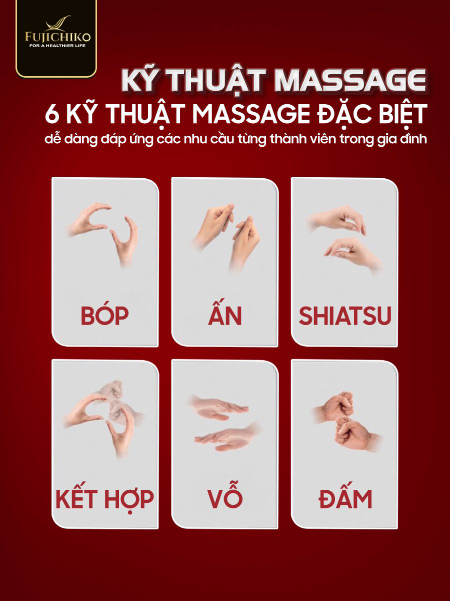 | Kỹ thuật massage | Shiatsu, nhào, ấn, kéo duỗi, vỗ |