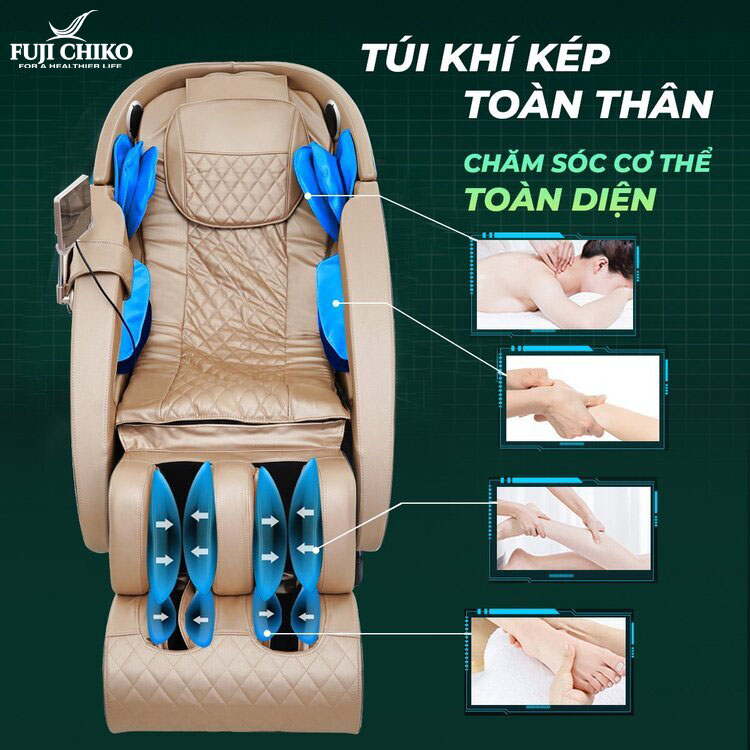 Hệ thống túi khí cũng là một điểm nhấn đặc biệt của ghế massage FJC - X3 Platium . Chiếc ghế này được trang bị hệ thống túi khí kép từ đầu đến chân hỗ trợ massage đa chiều, toàn diện đến các phần cơ bắp. Nhờ vậy những bó cơ mệt mỏi nhanh chóng được xoa bóp, thư giãn mang đến cảm giác cực đã, kích thích lưu thông máu, loại bỏ tình trạng căng cứng cơ hiệu quả.